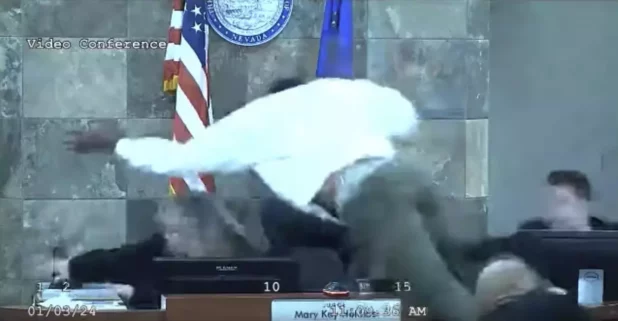 In a violent scene captured on courtroom video on Wednesday, Deobra Delone Redden jumped over a defence table and the judge’s bench, knocking the Clark county district judge Mary Kay Holthus from her seat and against a wall then pulled her to the floor. She sustained some injuries but was not sent to hospital, courthouse officials said.