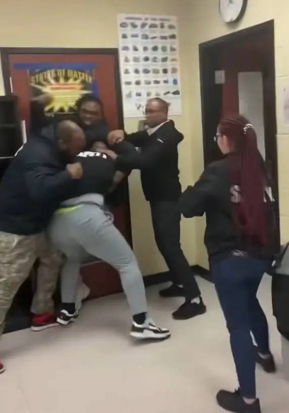 The teacher was seen trying to fend off the security agent with punches before he was taken down on a classroom floor at Harrisburg High School, according to WHTM-TV.