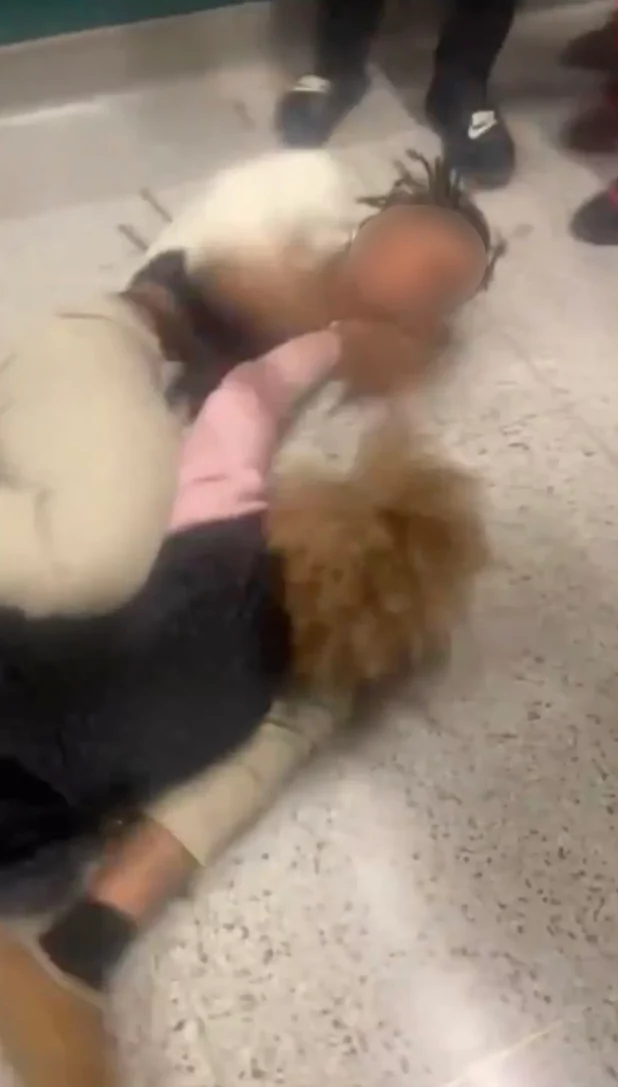 The two continue to wrestle on the floor before some students try to pull the girl off the teacher, who rises to her feet just to fall back down.
