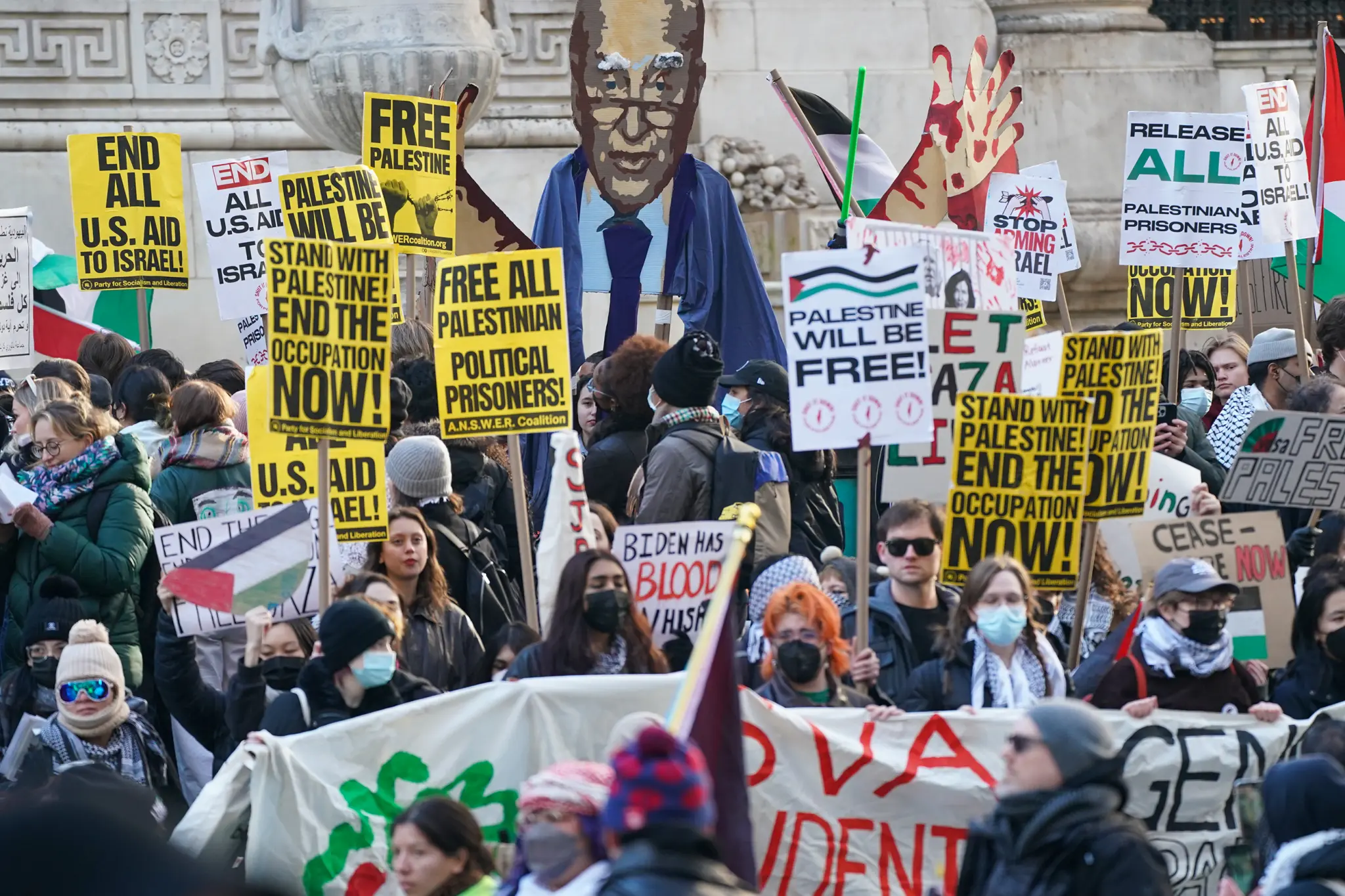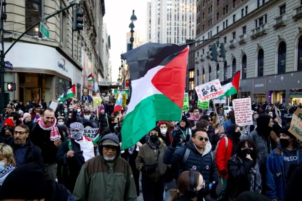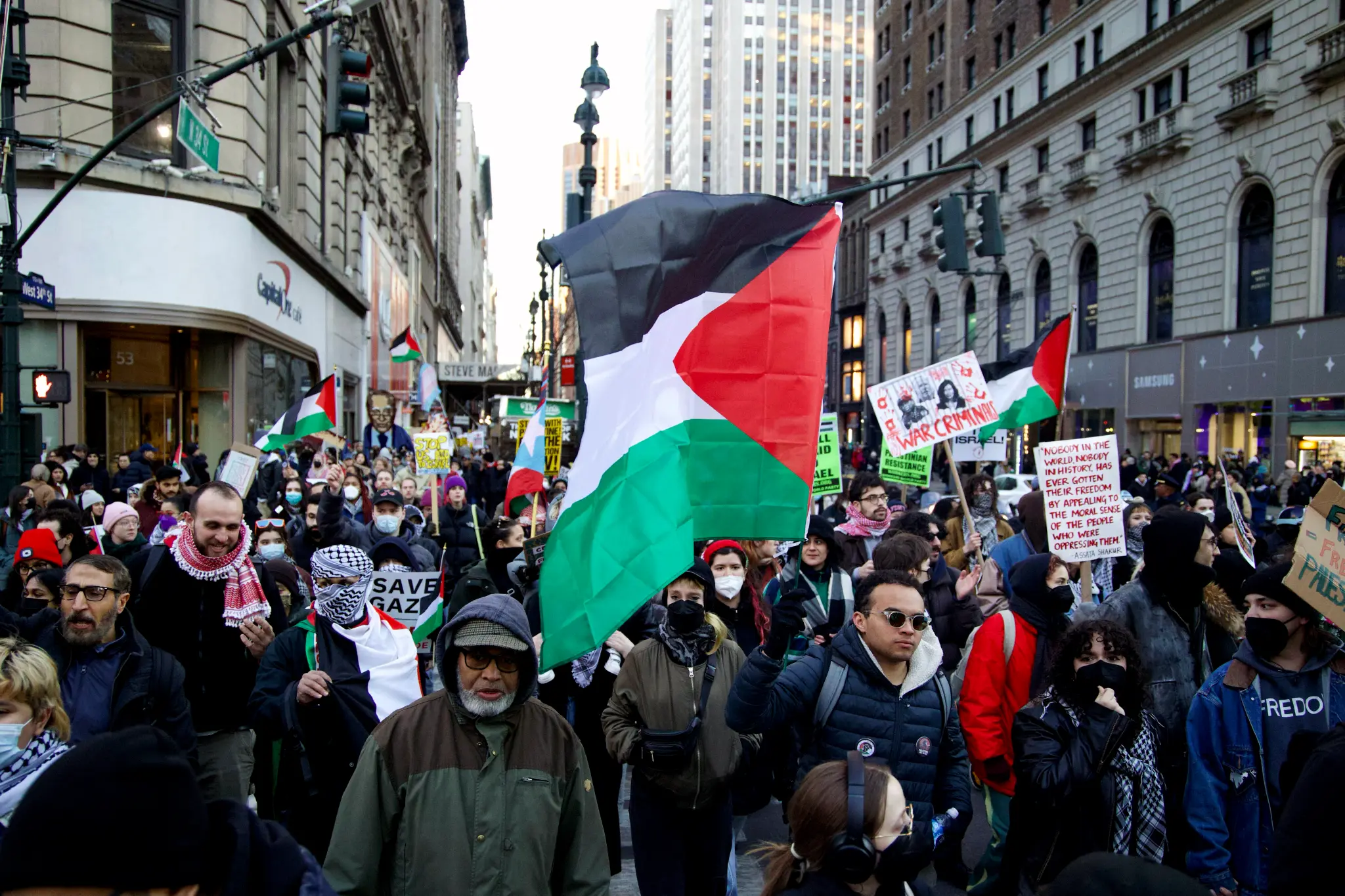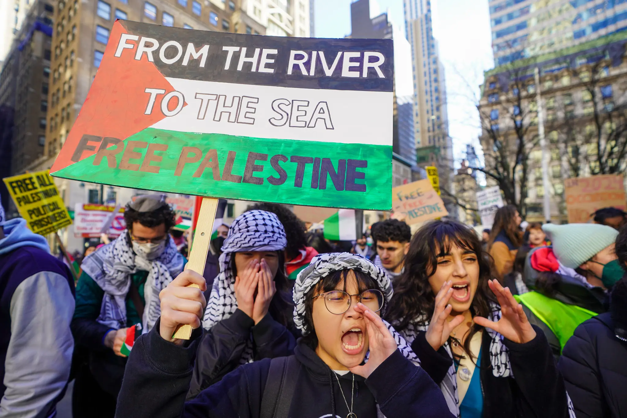 The rally started around 3 p.m. at the New York Public Library on Fifth Avenue, where demonstrators stood on the steps shouting “Free Palestine,” as others played drums and chanted “From the land to the sea, Palestine will be free.”
