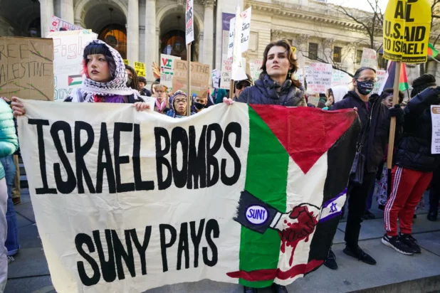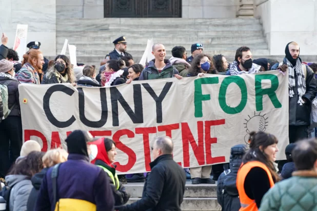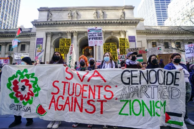 Some protesters from the School of Visual Arts stood in Bryant Park with huge banners that said “SVA Students against Genocide.” Others, notably a number from Hunter College, held smaller signs that read “CUNY students stand in solidarity.”