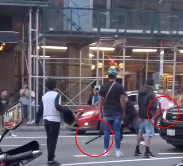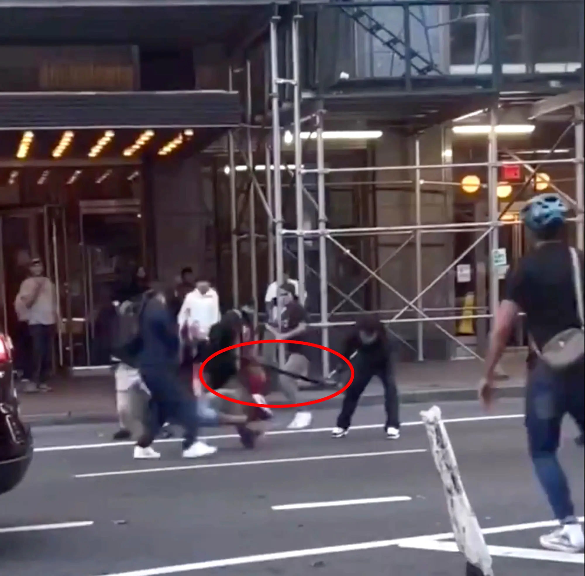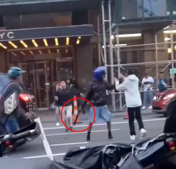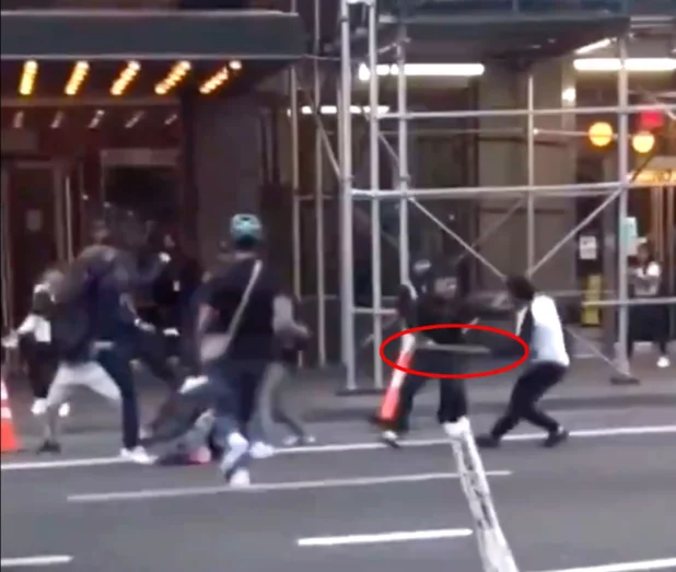 At one point, one of the violent migrants comes up behind another and smacks him in the head, knocking the helmet off his head before retreating across Eighth Avenue, the video shows.