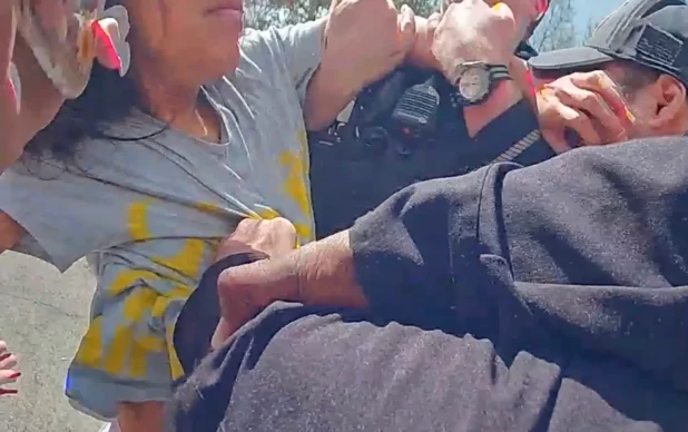 That’s when a migrant woman — identified as 24-year-old Yainilet Hernandez — pushes the officers, then blocks the door of the police vehicle to bar cops from putting Kent inside.