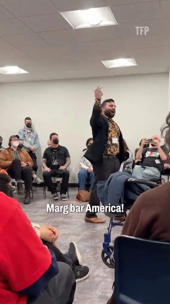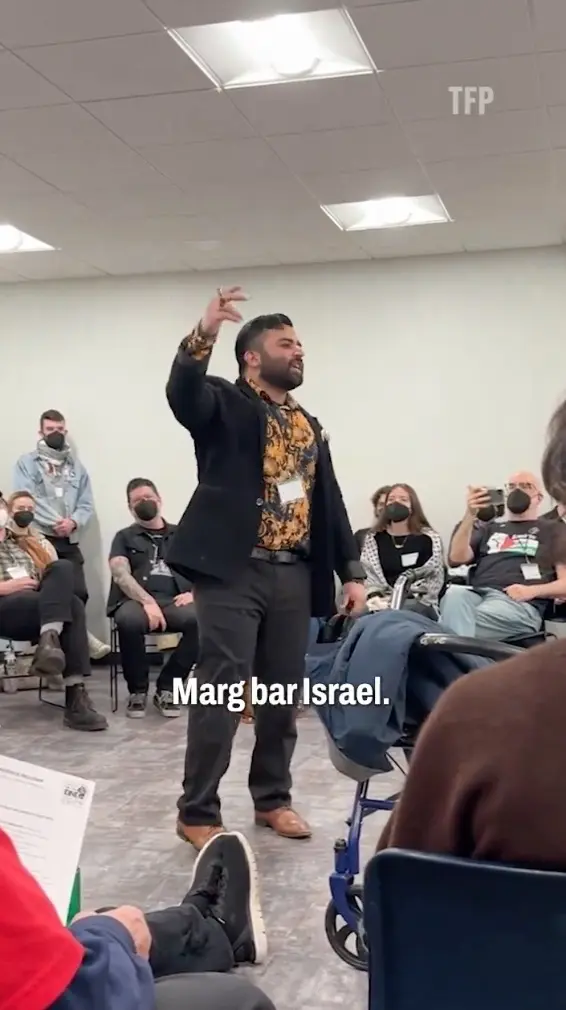 Video shows immediately after making his statement the crowd began to chant “hands off Iran!” according to The Free Press.
