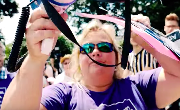 A fat old white bitch assaults him with a megaphone, talking about how he’s a scared little baby. She begins a “no vagina, no choice” chant that rolls through the crowd.