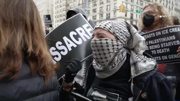 The pro-Israel demonstrator then yells into the camera, “Get these f—ing lunatics! Why don’t you arrest them?”