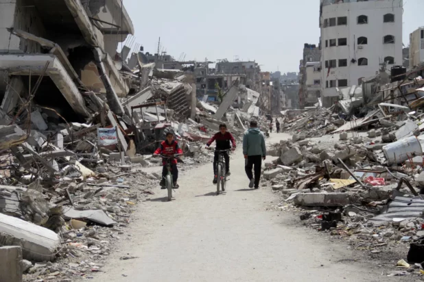 Six months after the conflict began, Reuters cameramen took bicycle rides along its ruined streets to gauge the destruction left by Israeli air strikes that have killed more than 33,000 people in retaliation for Hamas’s Oct. 7 attack on Israel.