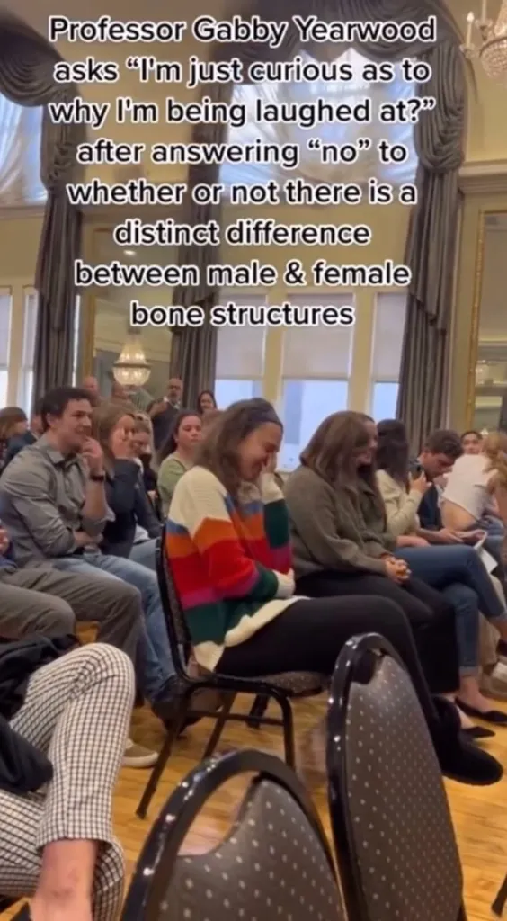 When @Riley_Gaines_ asked University of Pittsburgh professor Gabby Yearwood if an archeologist could differentiate between two sets of bones as male and female, Professor Yearwood. who calls himself the “expert in the room,” answers “no” to which the entire audience laughed. pic.twitter.com/Ecxs1NMDTr