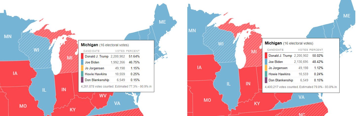 The “percentage counted” went from 77.3%-90.9% to 79.8%-93.8%, and Biden went from 46.75% to 48.42%, indicating that 100% of newly counted ballots were for Biden.