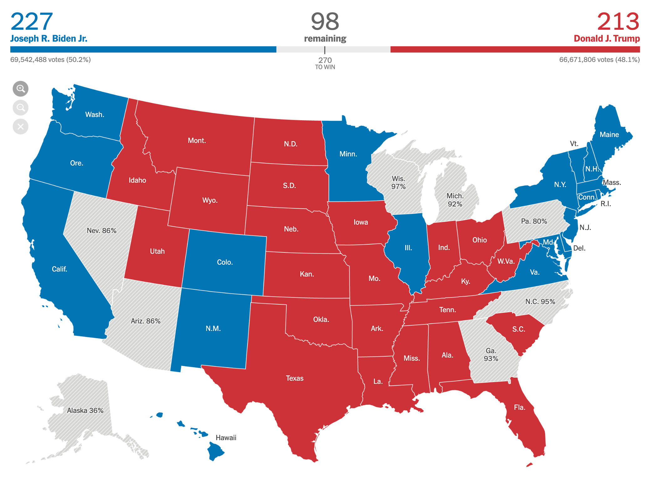 Right now, it looks like Biden is being given Wisconsin and probably Michigan. Arizona is pretty much locked for Biden. Nevada may or may not flip for Trump. Trump will likely get Pennsylvania, Georgia and North Carolina. Alaska is probably locked for Trump.