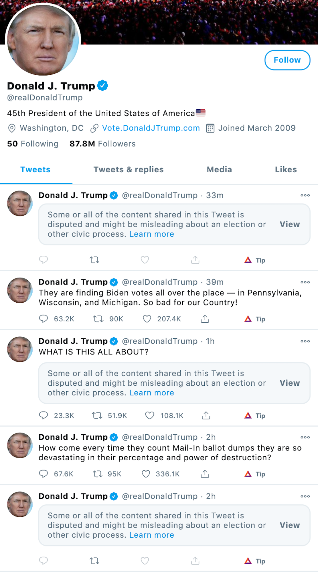 If you go to the Twitter page of Donald Trump right now, this is what it looks like: