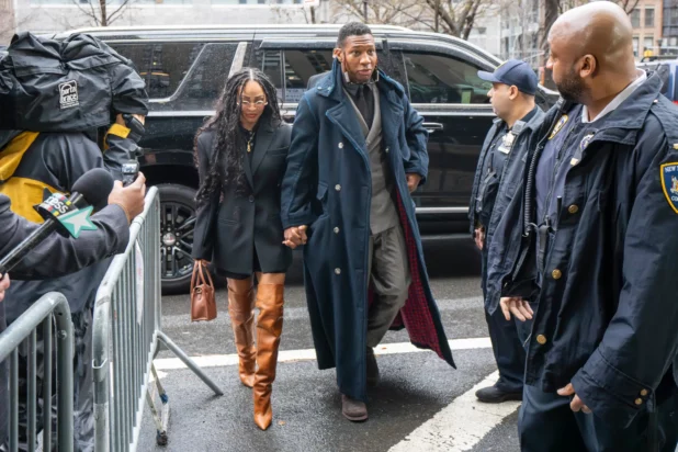 Meagan Good held onto Jonathan Majors’ hand outside of a New York City courthouse Monday after he was found guilty of harassment and assault.