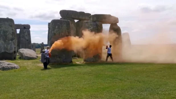 Environmental protesters sprayed paint on Britain’s Stonehenge on Wednesday, with orange marks covering some of the stones of the prehistoric megalithic structure on the eve of the summer solstice celebrations.