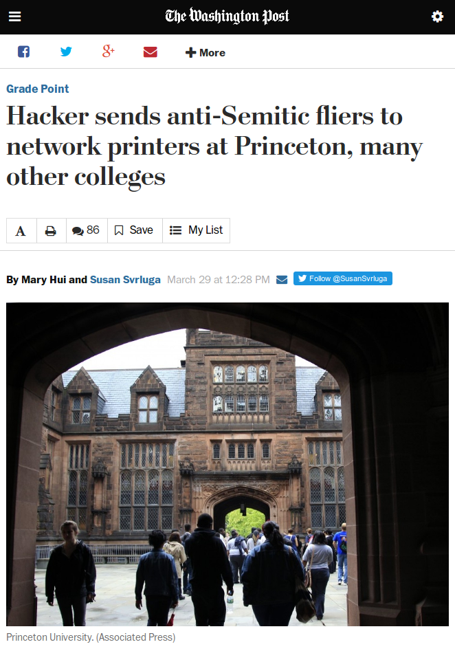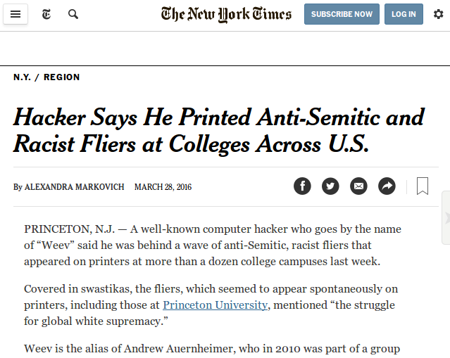 Andrew Anglin, the publisher of Daily Stormer, told the Daily Princetonian on Friday that the fliers came from Auernheimer. Anglin told The Washington Post that Auernheimer — known by the alias “weev” online — “did this monumental deed.” Anglin called the hacker “a true hero” whom he supports in “all his heroic endeavors.”
