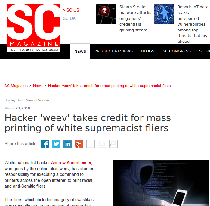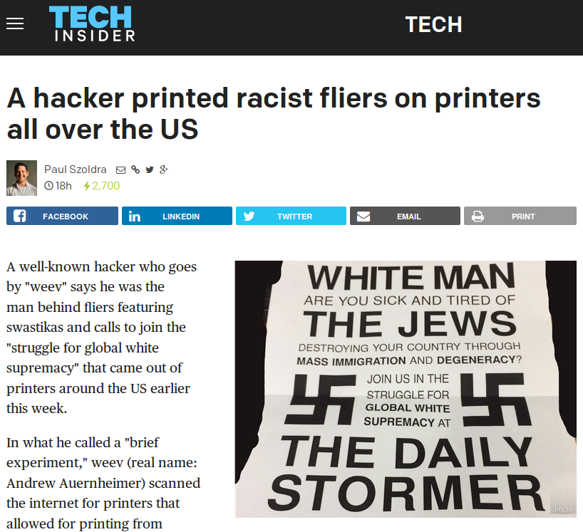 It’s official: weev’s printer troll, wherein he remotely sent Daily Stormer flyers to open printers across the planet, is the greatest troll of all time.