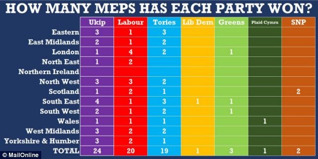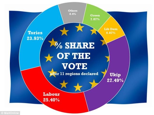 With 11 regions declared, UKIP has won more than 27 per cent of the vote, electing 24 MEPs, leaving Labour and the Tories to battle it out for second for the first time in 100 years.