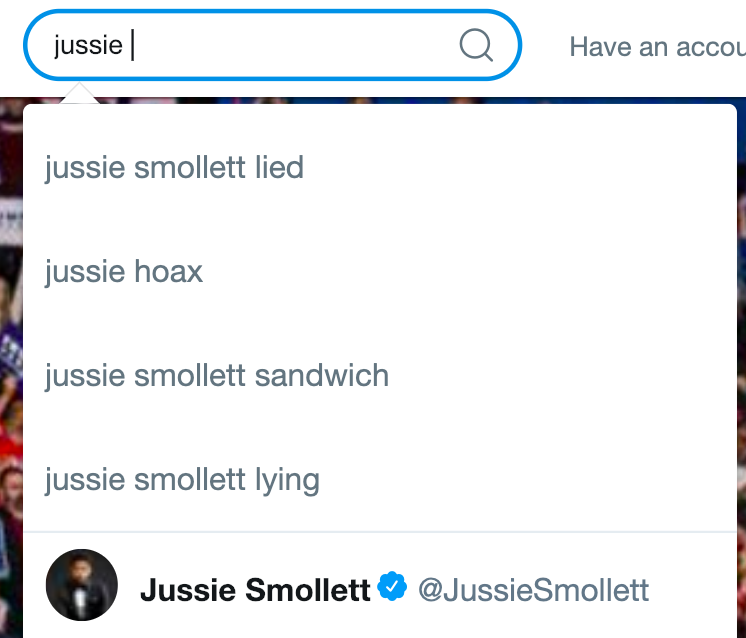 If you type “Jussie” into the Twitter search, this is what autofill options it gives you: