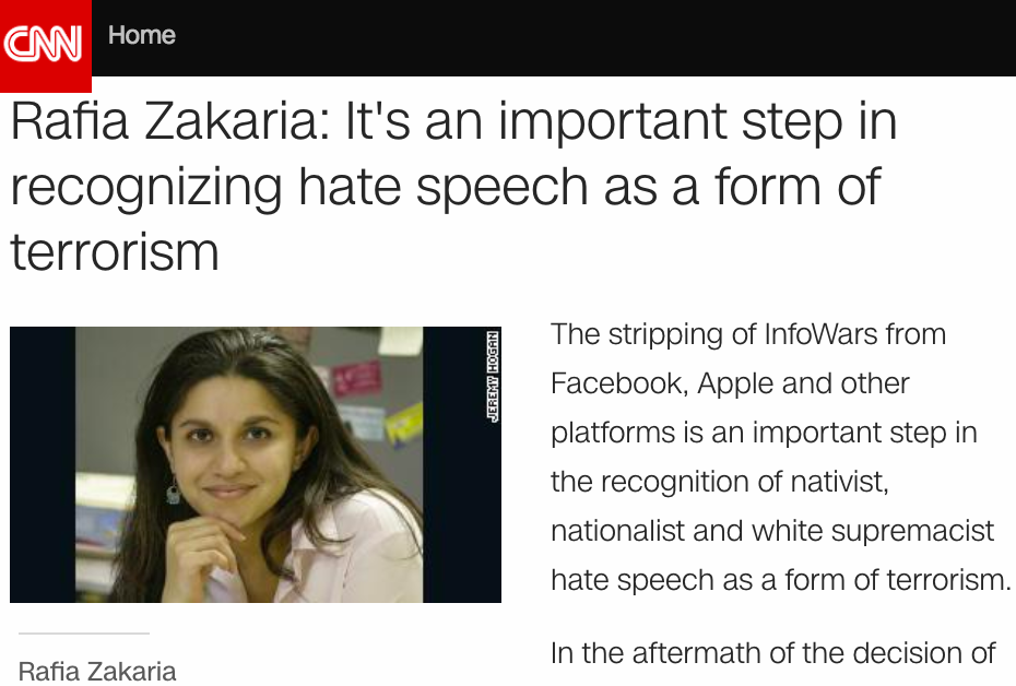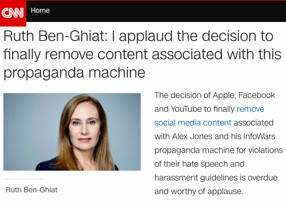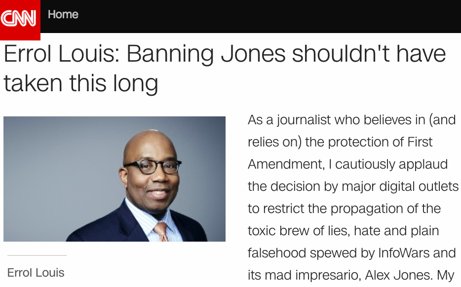 Speaking of the First Amendment and CNN and Alex Jones – what did CNN publish when there was an organized conspiracy by the entire tech industry to shut down Alex Jones?