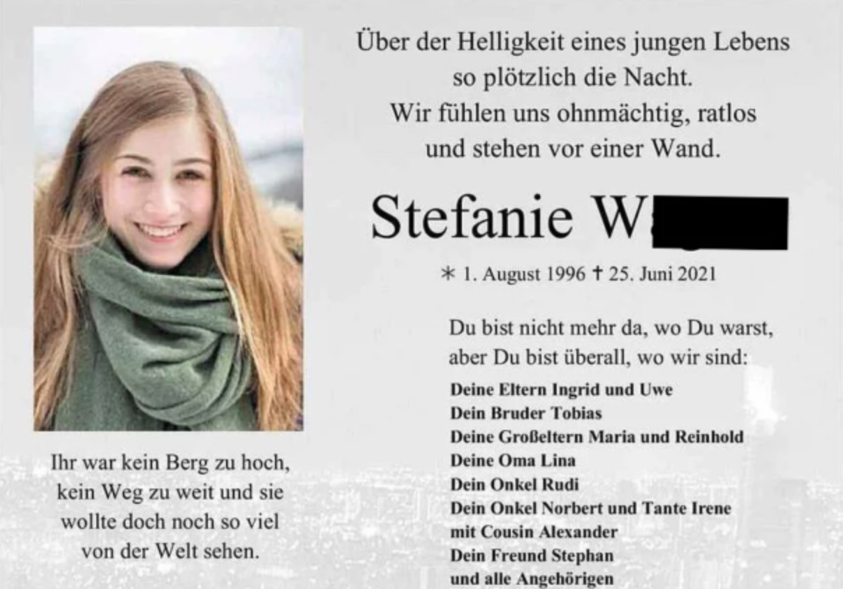 Stefanie was stabbed to death in Würzburg, one of three women. She was the youngest, and the only one whose photo has been released.