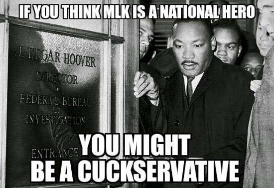 Superiority is thus shown by not working in your own interest. As Mr. Lewis replied to Mr. Erickson’s initial tweet about cuckservatism, “They want you to be tribal–to only advocate policies that help your tribe. Otherwise you’re a cuckold.” This is an implicit admission that cuckservatives are consciously not helping their tribe. They seem to think it would be immoral and would lower them somehow. Meanwhile, every other tribe on earth aggressively advances its own interests. The original definition of cuckold–a man who raises the offspring of another–comes to mind when we think of conservatives’ apparent glee at the replacement of Americans with ethnocentric Third Worlders. But the moral calculus of men like Mr. Lewis and Mr. Erickson reflects a deeper perversion. Like the man who begs to watch as he is cuckolded, they reframe the reality of inferiority as a kind of weird proof of superiority. Their own degradation is proof of their imagined virtue and make-believe power. The same mental gymnastics take place when it comes to ideology. One of Mr. Lewis’s objections to “racial tribalism” is that it betrays “Dr. King’s vision.” To make such a claim in 2015 reveals either astonishing ignorance or willful deceit. King explicitly supported racial preferences for blacks and pushed policies more extreme than what Mr. Lewis describes as the “left” racial tribalism of “Netroots nation.” Since Matt Lewis grounds his surrender to leftism in his ostensible Christian belief, he might be also be interested to know that “Rev.” King didn’t just regularly commit adultery but denied the divinity of Christ.