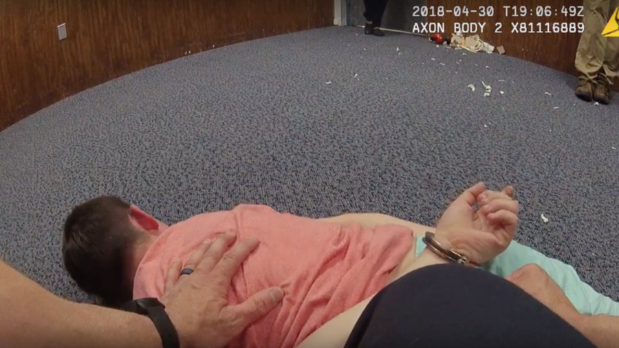 Once they have arrived in the room, the officer places the child on the ground and says “do you want the handcuffs?” Thomas is then cuffed while he screams and the teacher watches from a corner. According to the footage, Thomas was handcuffed three separate times before his mother, Emily Brown, arrived.