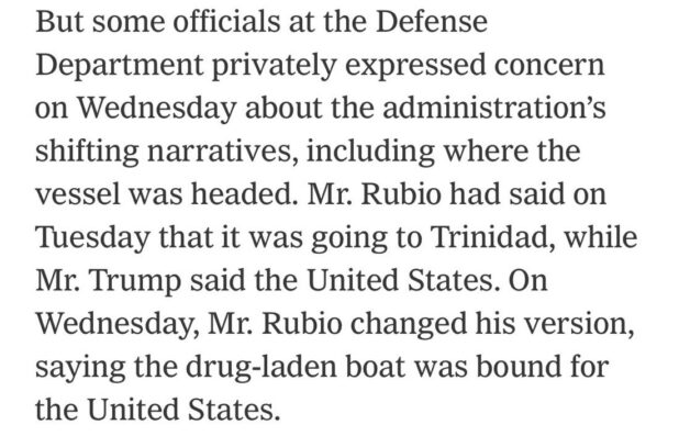 So, although we are not being told where the boat was, presumably, the fact that the Secretary of State said this (he presumably had been briefed on the location) means that the boat was somewhere between Venezuela and Trinidad and Tobago when it was blown up. To then say that they knew it was headed for America…