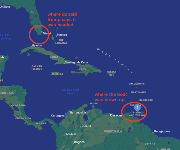 Though we don’t know exactly where the boat was when it was blown up, Marco Rubio initially said the boat was headed for Trinidad, which is literally right off the coast of Venezuela.