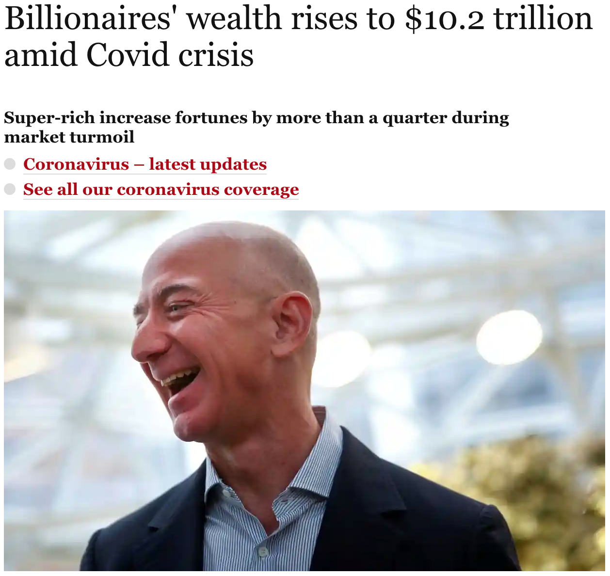 A report by Swiss bank UBS found that billionaires increased their wealth by more than a quarter (27.5%) at the height of the crisis from April to July, just as millions of people around the world lost their jobs or were struggling to get by on government schemes.