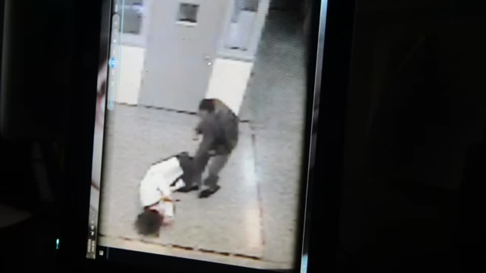The tape shows Porcelli, wearing a white lab coat and carrying a clipboard in her right hand, reaching to open a door to an office McRae was standing next to. As she approached the door, McRae feigned a punch, apparently prompting Porcelli to say something to him.