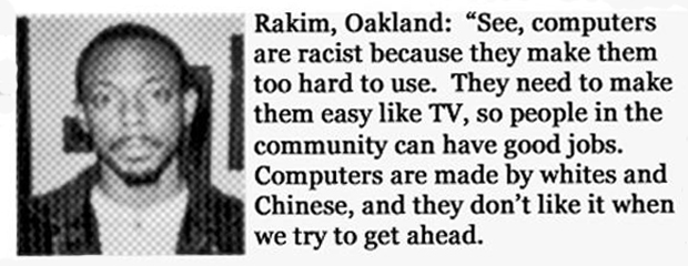 We even have a government that allows white people (as well as white supremacists of Chinese descent) to make racist computers.