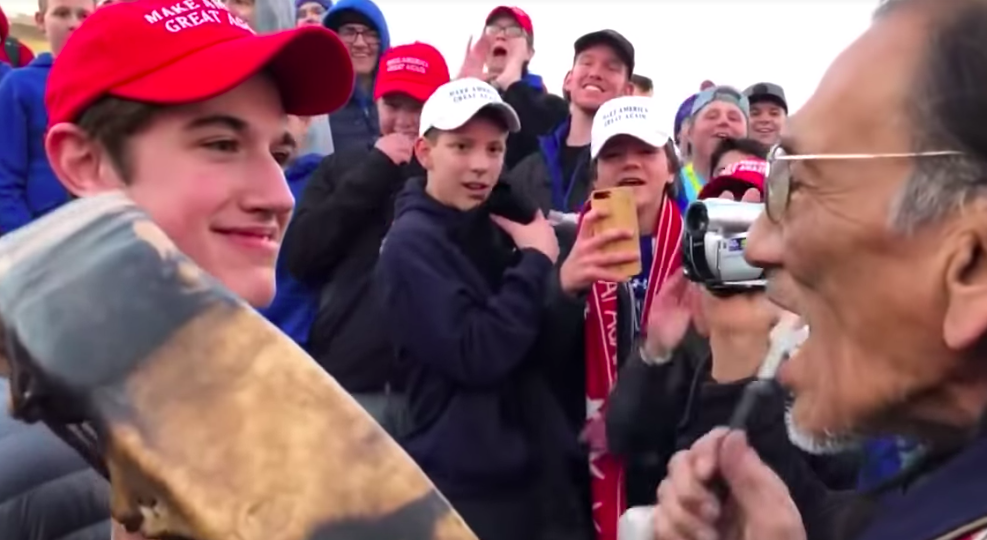 Videos of the confrontation show a smiling young man in a red Make America Great Again hat standing directly in front of the man, who was playing a drum and chanting. Other kids could be seen laughing, jumping around and making fun of the chants.