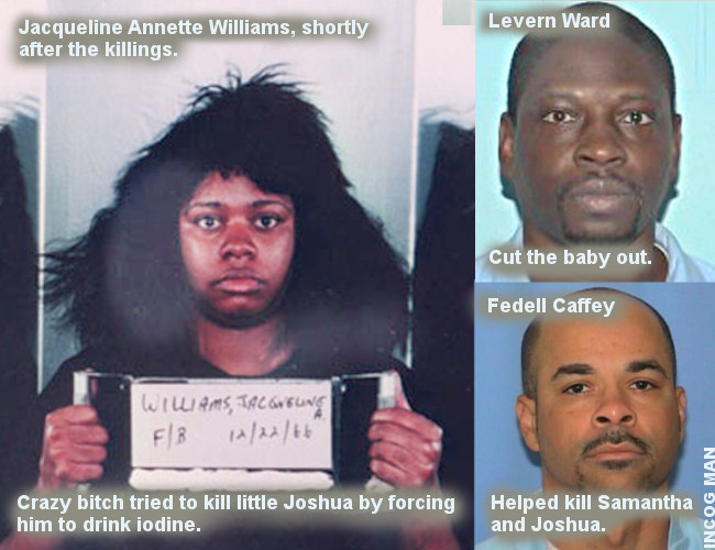 Back in 1995 a nearly full-term pregnant woman named Debra Evans had two White kids, 10 year-old Samantha and 8 year-old Joshua, from a previous marriage to a White man. She later stupidly hooked up with a black named Levern Ward, had his mulatto kid, Jordan, and was also knocked up by him before he finally split the scene. Ward had a mulatto cousin named Fedell Caffey, who was hooked up with freaky black chick named Jacqueline Annette Williams (photos below).