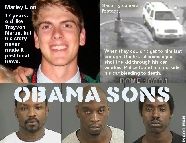 In June of this year, violent, White-hating Negroes shot to death Marley Lions, a handsome and popular young 17 year kid down in Charleston, South Carolina. The guy had left a party and thought he might be a little too drunk or was tired, so he did what might have been the safe thing and pulled off the highway to catch some winks in a nearby restaurant parking lot. Big mistake in this day and age.