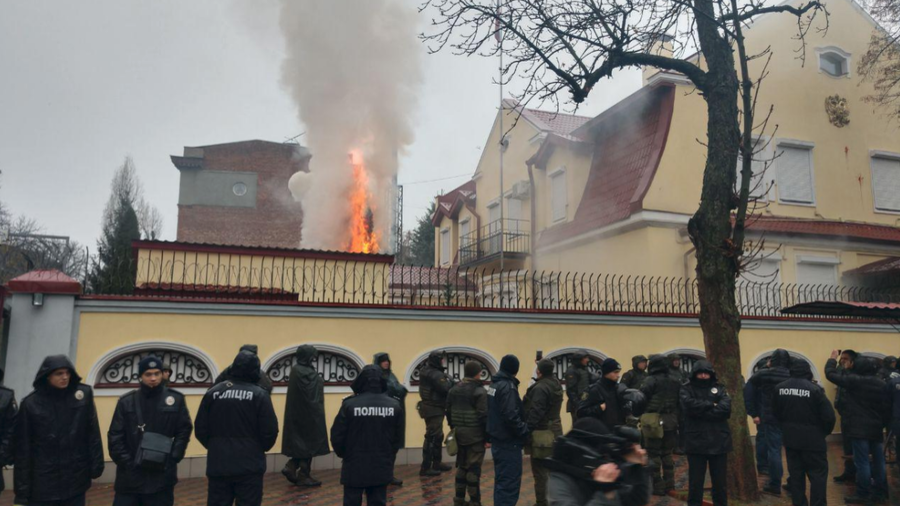 Scores descended on the Russian diplomatic facility on Kharkov, Ukraine, on Monday, one day after a tense standoff between the two countries’ navy occurred in the Back Sea.