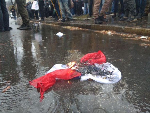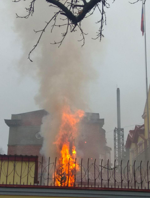 The rally heated up when some masked demonstrators lit flares and started hurling them at the Russian Consulate. One of the burning projectiles eventually landed behind the fence, and a fir tree outside the consulate building caught fire.