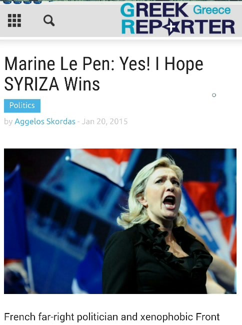 This goes beyond Greece however, in France yesterday the leader of what is called the “Far Right” Front National, Marine LePen made a statement that she will be supporting SYRIZA and hopes they win the national elections in Greece, even though she “Does not agree with their policy on immigration”.