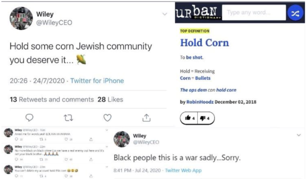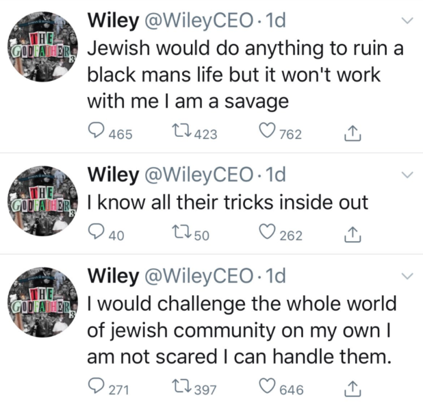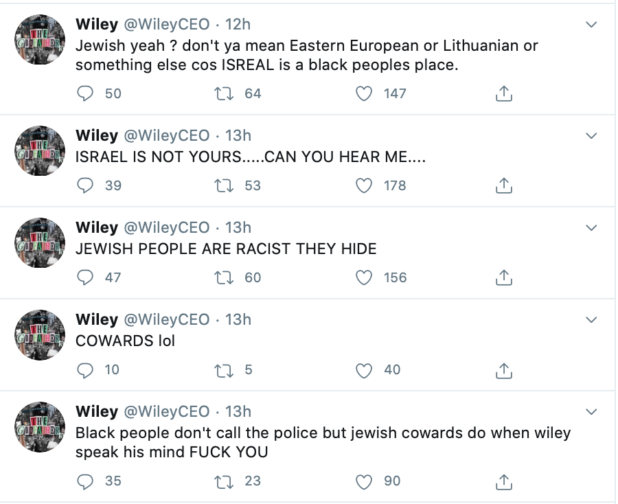 “We hope that the police will prosecute Wiley’s racial hatred and it should go without saying that Wiley should be banned from all social media platforms and his offensive tweets deleted,” she said. “There must be #NoSpaceforJewHate.”