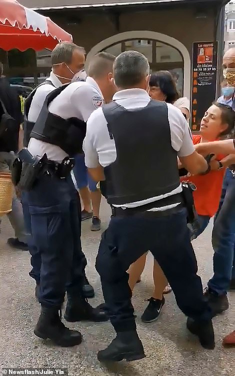 Elsewhere in France, police wrestled with a woman refusing to wear a mask after she remonstrated with officers and allegedly bit one of them in angry scenes at a market in Aubenas.