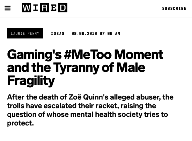 Describing men who are angry at what happened as having “male fragility” is ridiculous. People are rightly upset that Quinn made retard-tier allegations in order to try and start a hoax #MeToo movement in the gaming industry. And being angry at the situation does not make someone a “troll” as Penny suggests in her article. She’s deceptively conflating two very different concepts.
