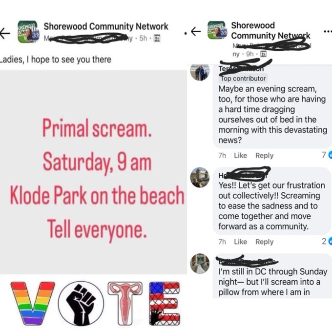 “What a gorgeous morning to gather at Klode Park in Whitefish Bay to engage in a Primal Scream in order to release our pain and frustration after the election,” Gibbs wrote in a Facebook post. “If you zoom in you will see Trump supporters proudly waving their flag on top of the hill.”