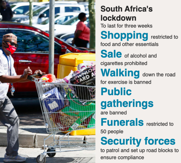 “The law is that you stay at home. The exception is for survival: food [and] health, with security forces making sure that the law is enforced,” government minister, Nkosazana Dlamini-Zuma, said.