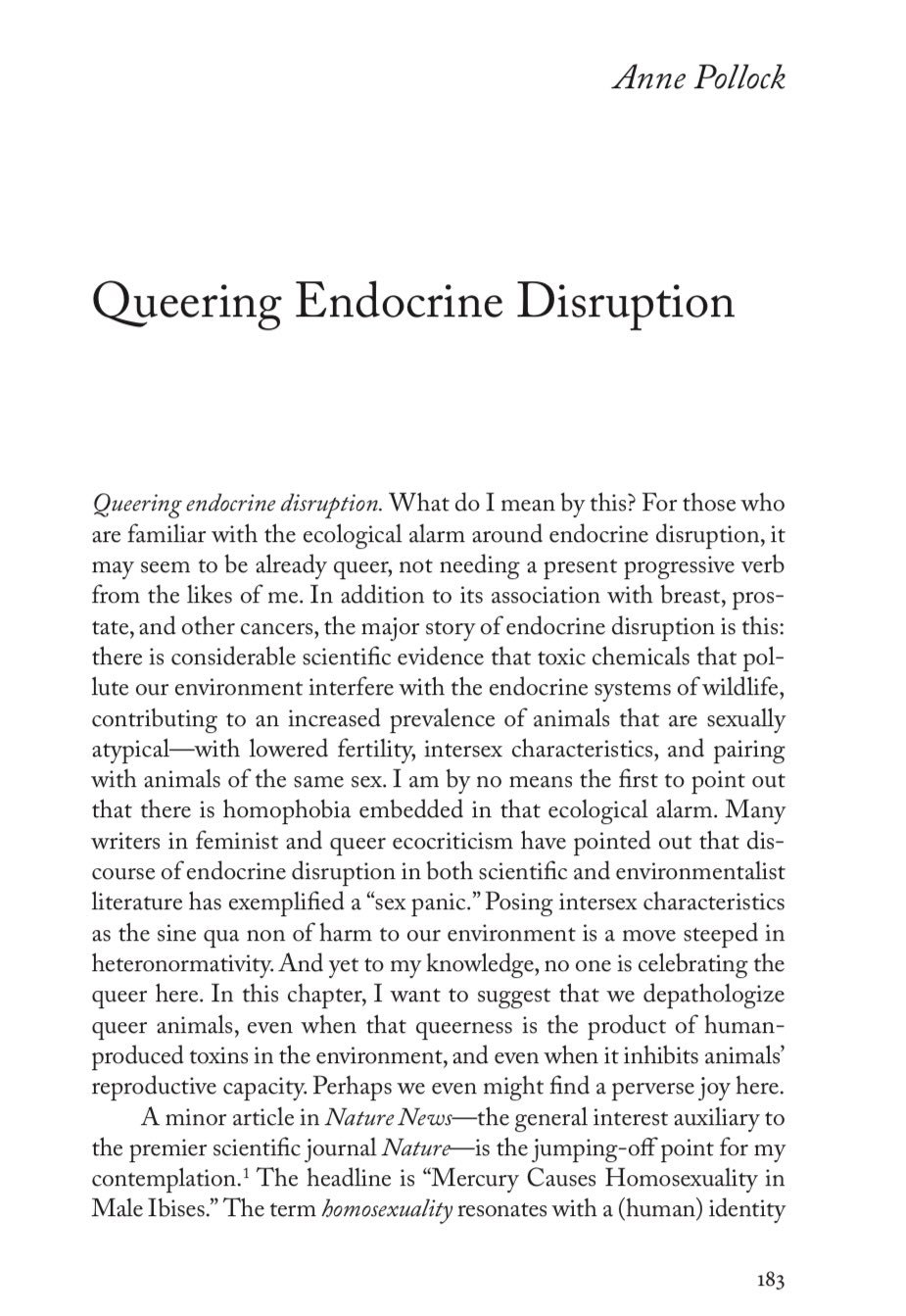 “I want to suggest that we depathologize queer animals, even when that queerness is the product of human-produced toxins in the environment, and even when it inhibits animals’ reproductive capacity,” scholar Anne Pollock wrote in a paper called “Queering Endocrine Disruption.”