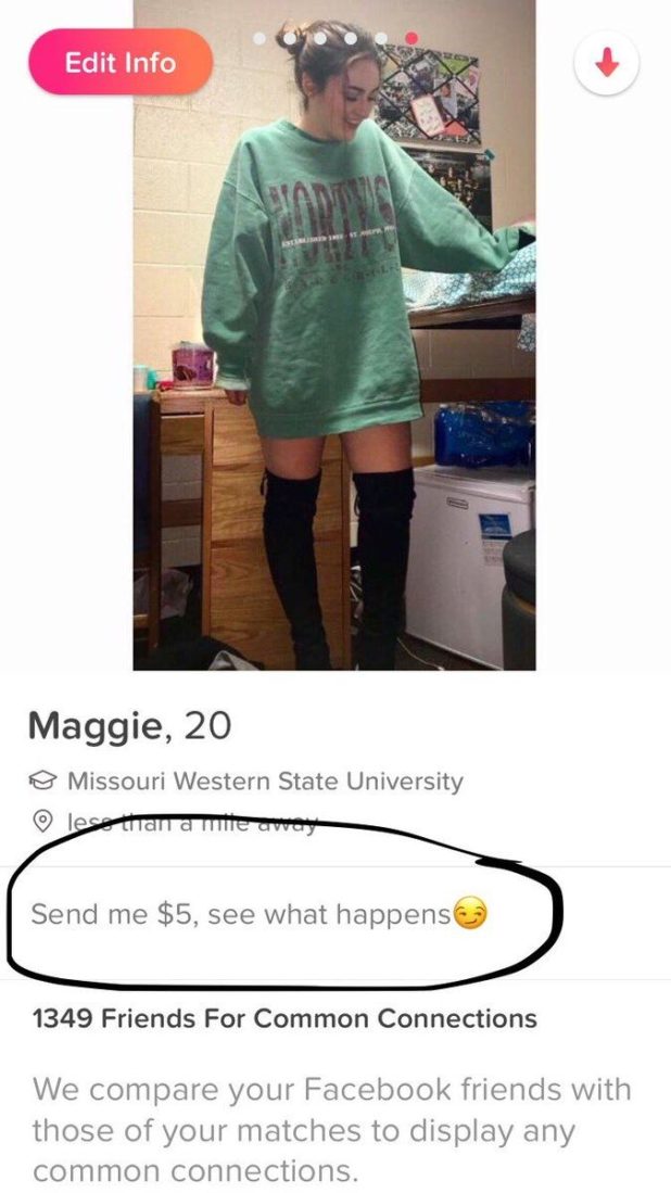 Archer’s Tinder bio, which can be seen in her now-viral tweet, reads: “Send me $5, see what happens,” with the little smirking emoji for punctuation. But why would anyone actually send this woman — or any stranger on Tinder, for that matter — five whole dollars, you may be asking yourself. As Archer’s PayPal history can tell you, it turns out a lot of people (*cough* men *cough*) are more than willing to fork over coffee money just to assuage their curiosity.