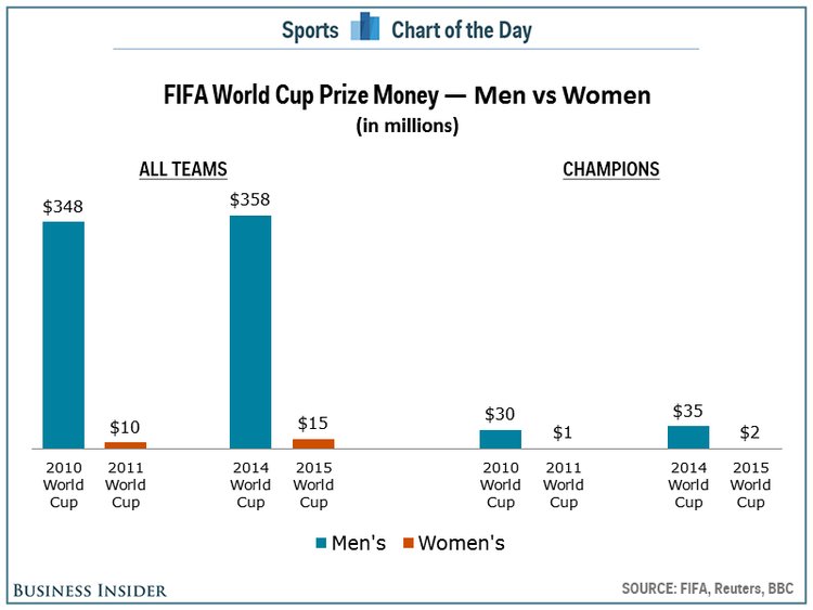 The 2015 Women’s World Cup brought in $73 million, of which the players got 13% ($10 million). The 2010 men’s World Cup in South Africa made $4 billion, of which the players got 9% ($348 million).