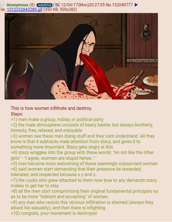 The alt-bugmen pushing “women in the movement” have never and will never respond to any of the points I just made, regardless of the fact that I’ve been making the same points for years. They will just keep screaming that I’m “alienating women,” and then question my masculinity. Because they are maggots who do not want to engage in the masculine activity of using logic to come to reasoned conclusions.