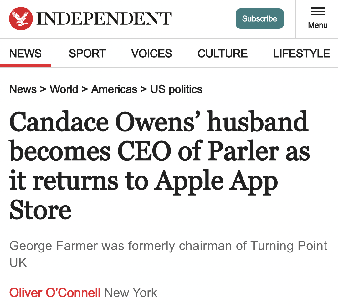 I’m not really sure this is a very good idea. Parler has been a disaster since launch. Maybe he can fix it, I don’t know. But it’s also suspicious because Candace Owens is one of Ye’s only confidants right now, and what does her husband do for work?