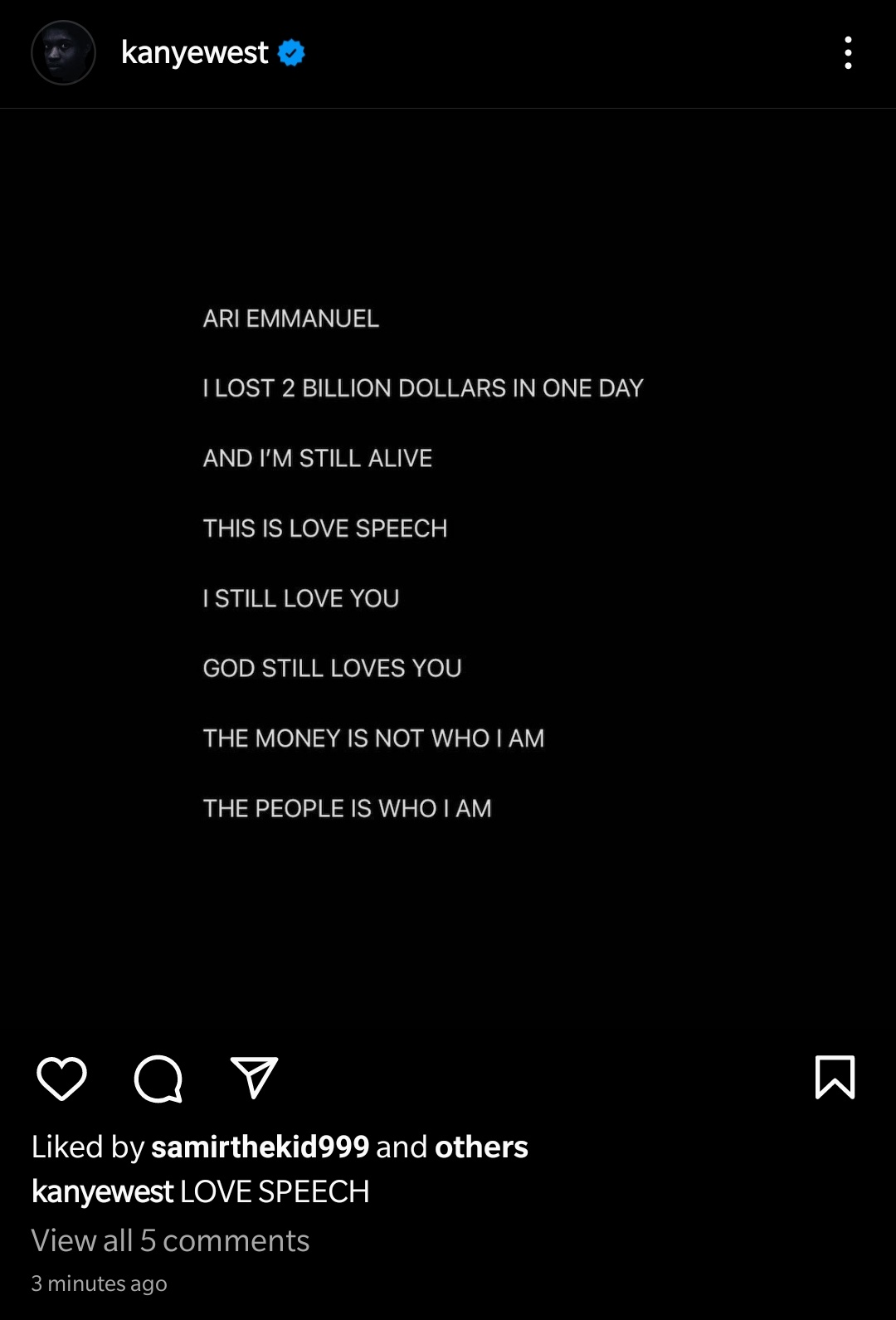 It’s not clear how, but Ye is back on Instagram and he is posting love speech.