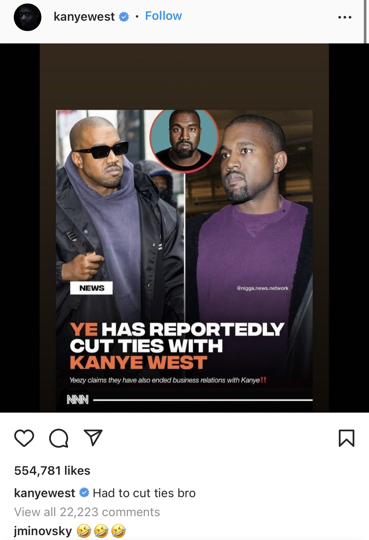 He responded to that ratty Jew Ari Emmanuel, who ordered Adidas and others to cut ties. He said he lost 2 billion dollars in one day, which is the same number the media is giving. He said that the people is who he is.