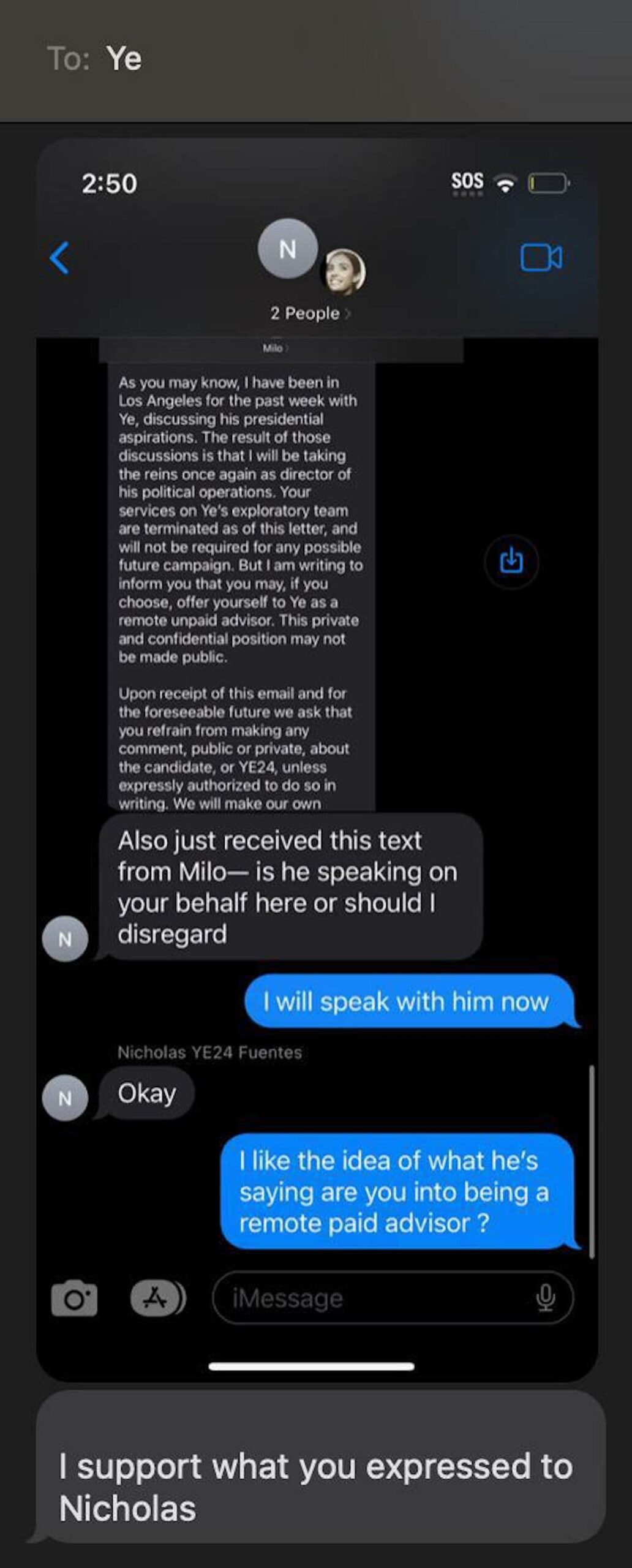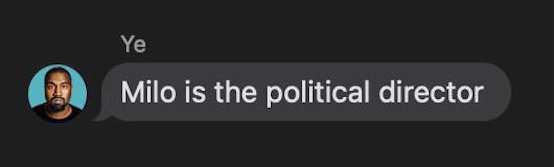 I support Nick fully, and know he’s going to make the right call here. The fact that he hasn’t made a statement at all tells me he’s looking for an exit. Maybe he’s still trying to convince Ye that MILO is poison. Whatever the case, I can guarantee you he’s not going to stay on the campaign as an employee of MILO.