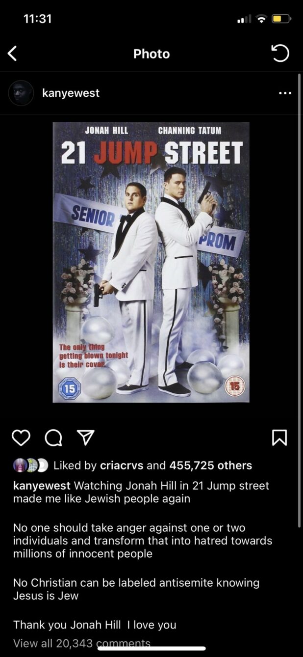 The few comments we did get from Ye were things like him saying he has no problem with the Jews anymore because Jewish actor Jonah Hill was funny in the Hollywood film 21 Jump Street. He also included the offensive and false and blasphemous statement that “Jesus was a Jew.”